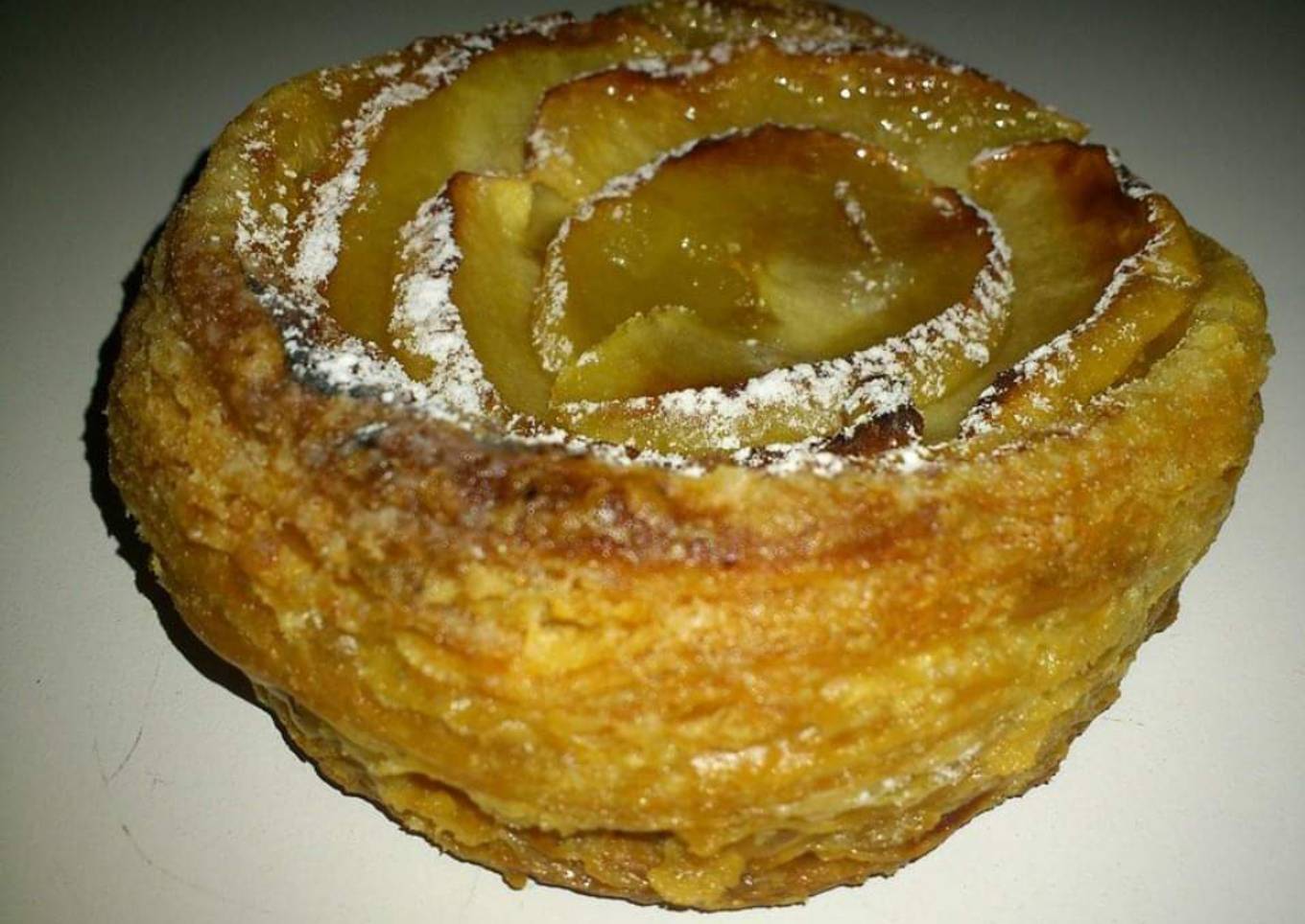 - Après étalez un peu de compote de pomme sur la pâte et placez les tranches de pommes joliment en sorte de faire une rose.