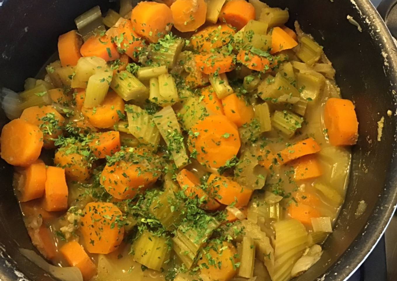 - Éplucher les carottes les couper en rondelles laver les branches de céleri les couper en tronçons ajouter les carottes et céleri dans la marmite mélanger