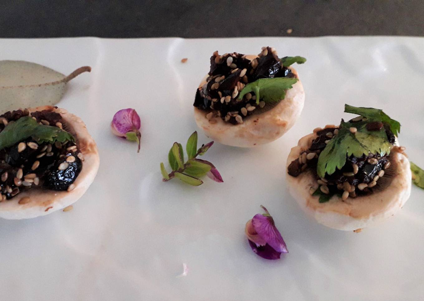 - Hachez grossièrement les olives noires. mélangez les avec 2 c à soupe de graines de sésame et un peu de coriandre coupé finement. Posez une c à café de ce mélange sur chaque tête de champignon.