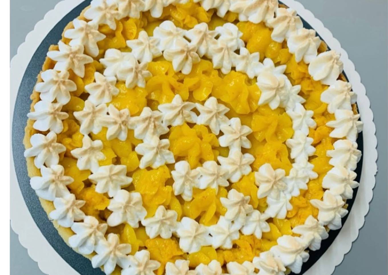 - Transvaser la meringue dans une poche à douille et garnissez le dessus de la tarte.