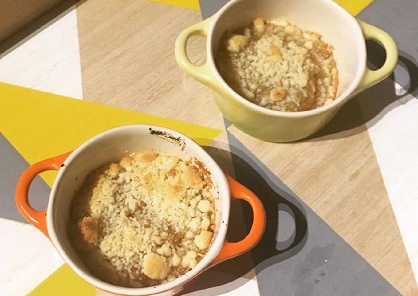 - Remplissez vos petits remequins des pommes cuites, saupoudrez de pâte à crumble et passez au four pour 20 minutes. A déguster tiède !