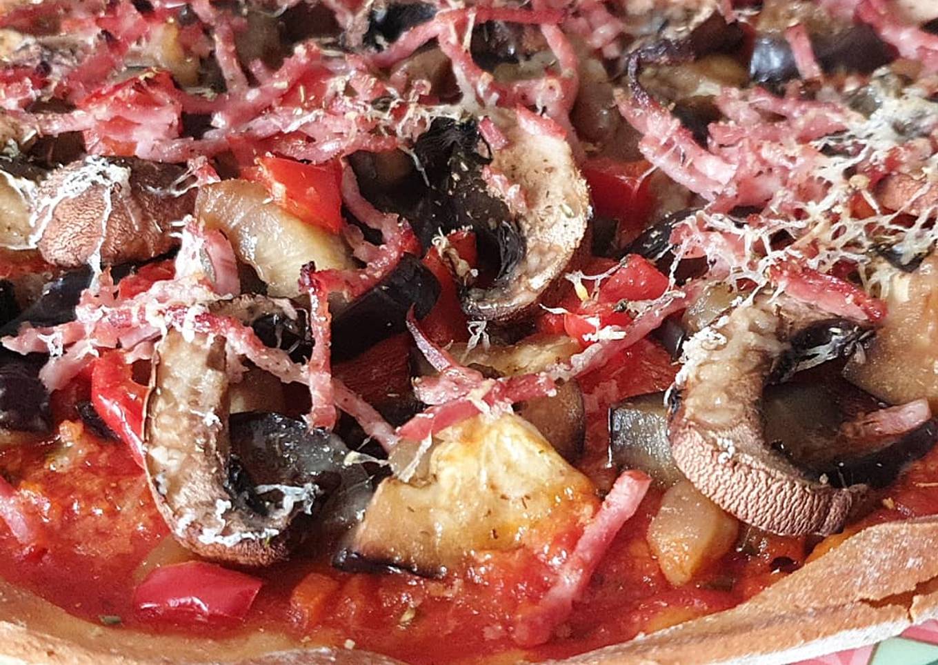 Pizza ss gluten au légumes/allumettes de jambon et champignons