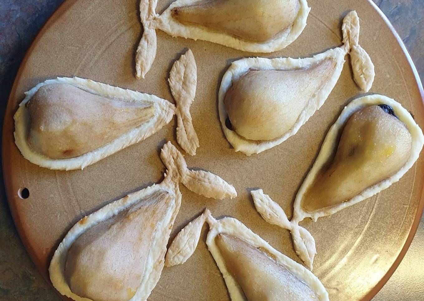 - Lorsque les poires sont cuites, déposez un carré de chocolat au milieu et disposez les sur une pâte feuilletée.