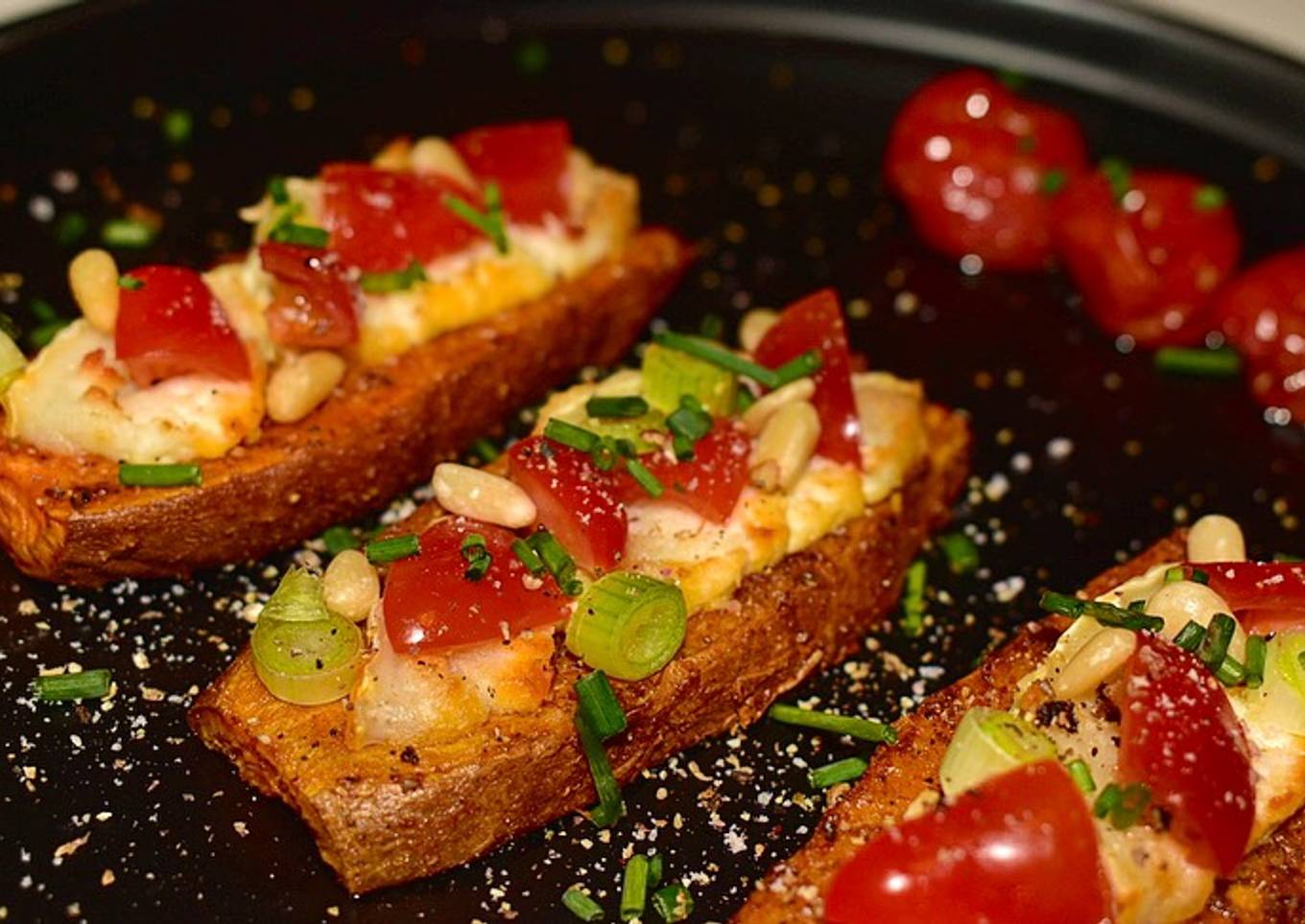 - Sortez les tranches gratinées du four et agrémentez-les de morceaux de tomates cerise, de cébettes et de pignons torréfiés.