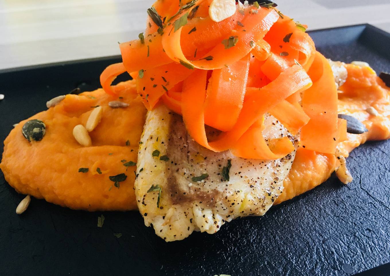 Cabillaud Purée de Patate douce et Carotte au lait de coco Tagliatelles de Carottes mi-cuites
