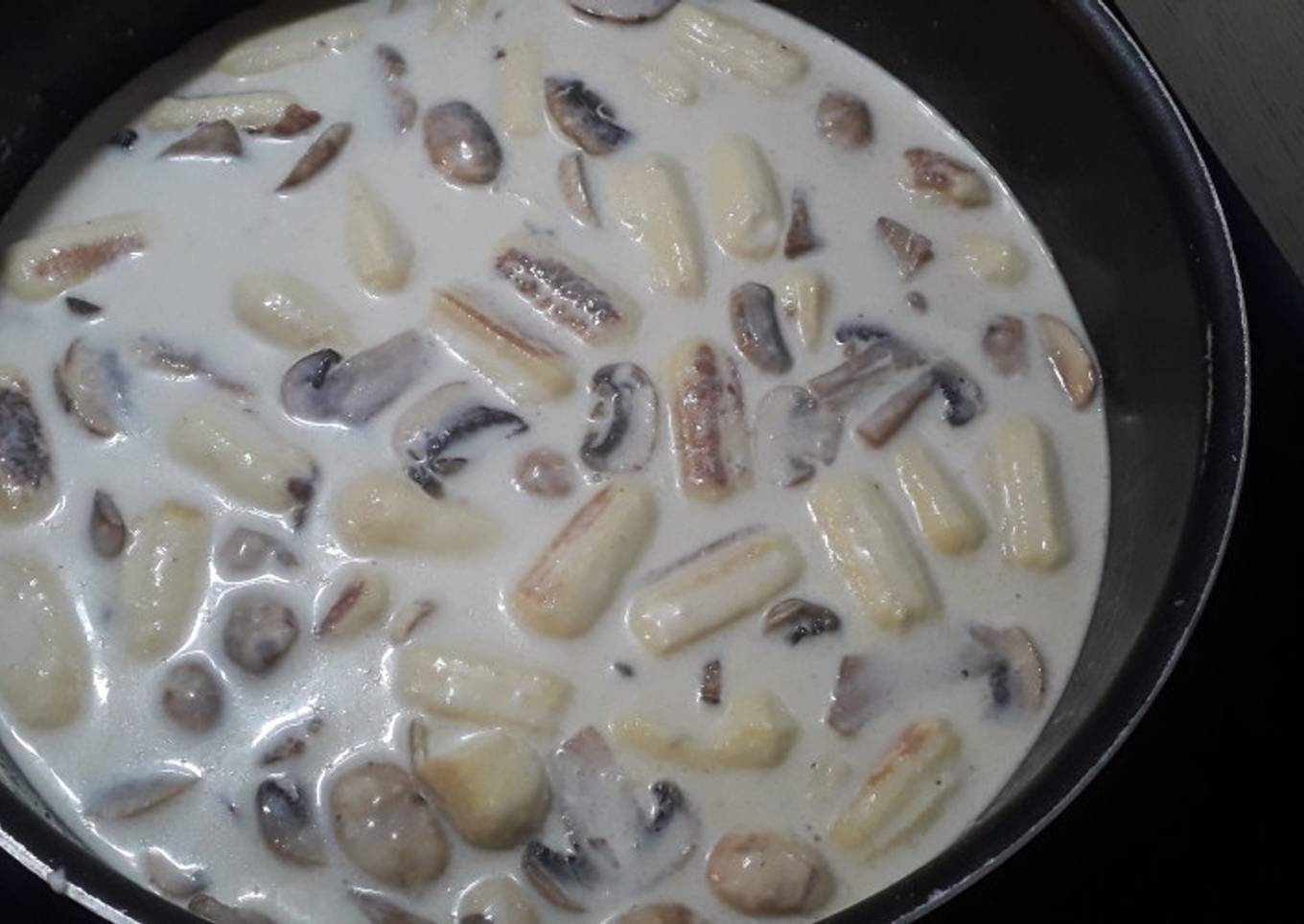 - En même temps, faites te revenir les champignons dans la poêle, puis ajoutez les quenelles, laissez mijoter.